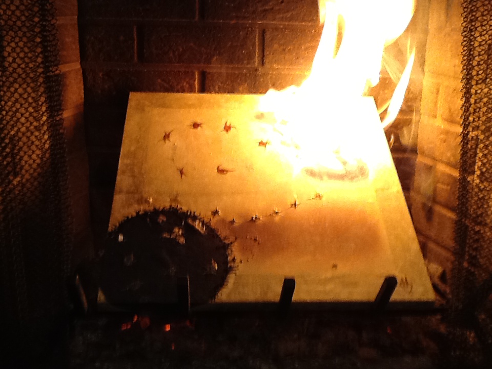 (NOTE on the image: This is a painting on paper that was sadly damaged beyond repair. The burning of a work of art is not the same as the burning of a work of nature…or is it?)