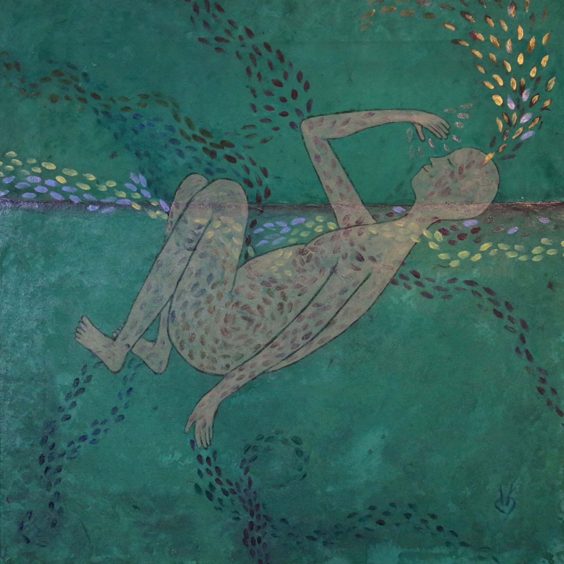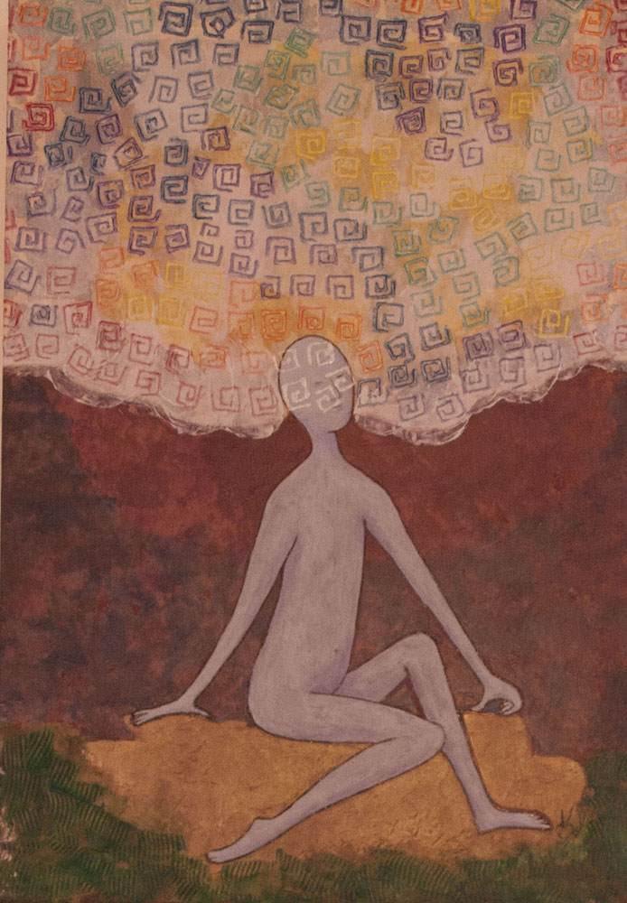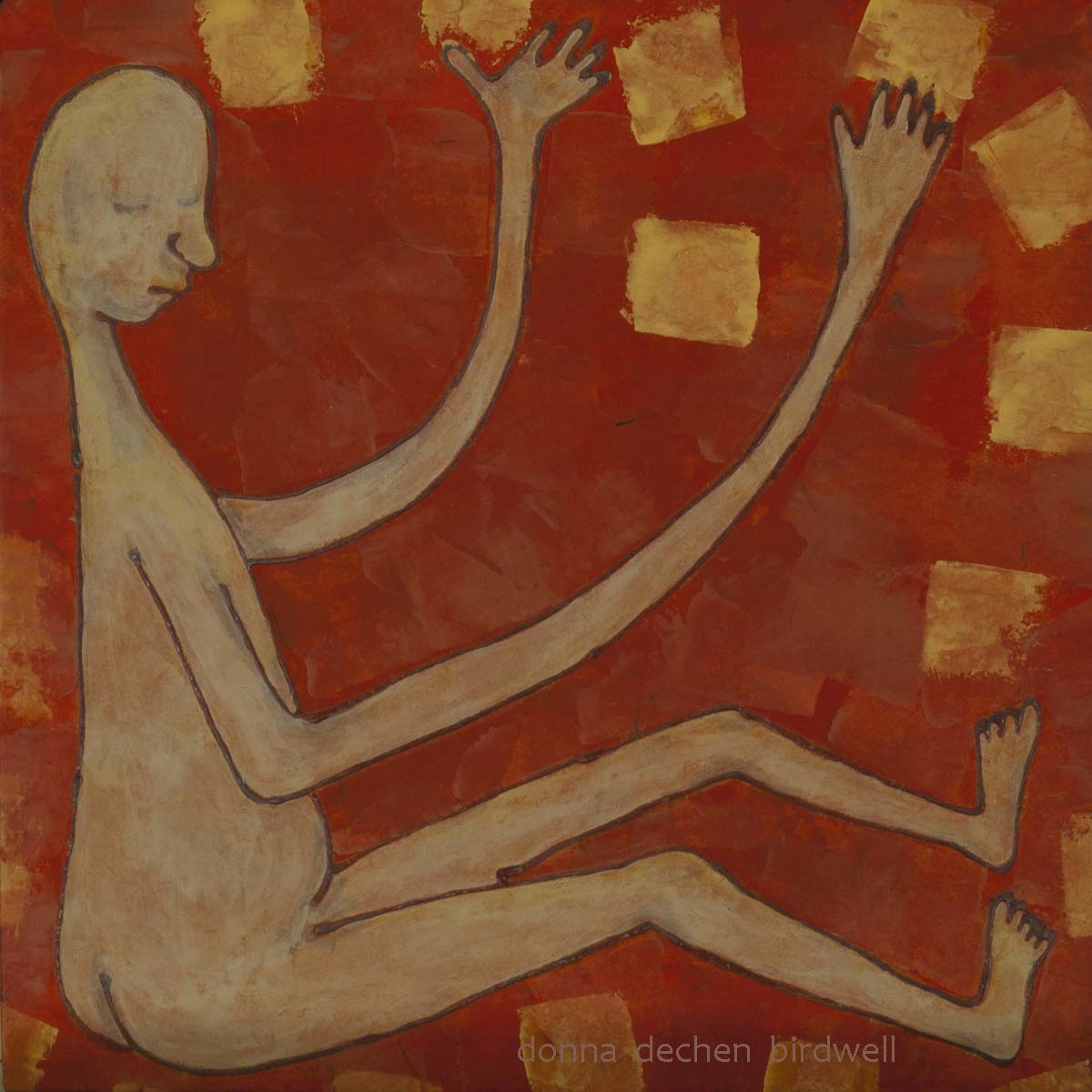 When I started my “beings” series of paintings, I wanted to represent not what a body looks like but rather what it feels like to be inside one. My figures are unsexed, ungendered, unclothed, hairless, and of indeterminate age. They have no ears and invariably have their eyes closed, indicating an inward rather than outward focus. The body, after all, is not just an external form, not this thing the world sees. It’s all the feelings and sensations that we wouldn’t have without it. The figures in my paintings are very expressive, but less in terms of facial expressions than in how their bodies occupy space – posture and gesture and implied movement.