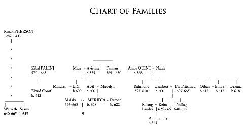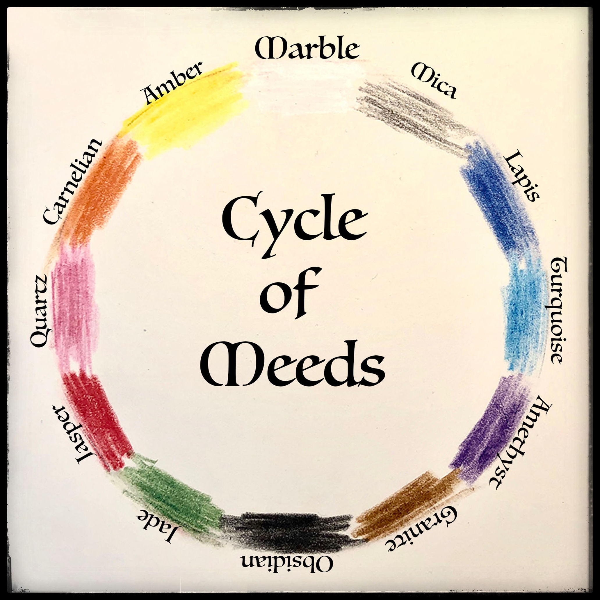 There are twelve named returns corresponding to the twelve types of stone from which a Benison is crafted to mark the start of each return (see diagram). A full cycle of returns comprises a meed, and meeds are named in the same sequence as returns. The completion of a full cycle of meeds is called a Great Turning. Returns of the current cycle are called New,with previous cycles referred to as Old, Ancient, and Preterit, in that order. A particular event is “dated” by one saying that it occurred in a “Fogtide of the Amber Return of the Old Jade Meed.”