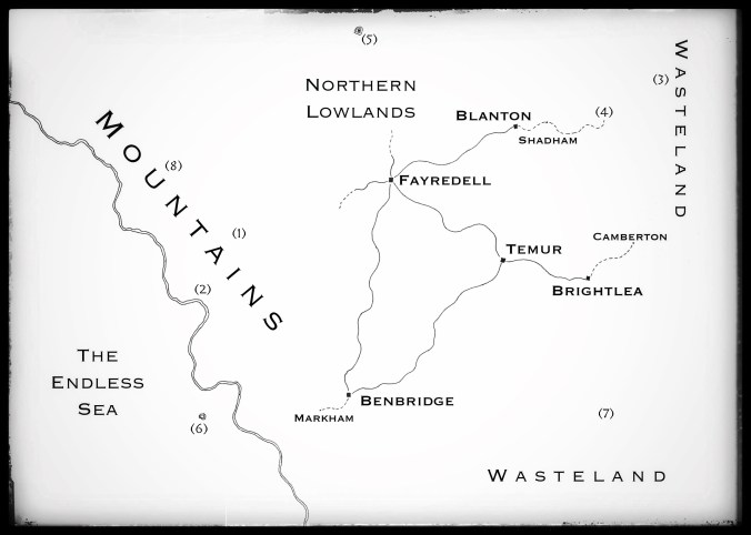 The map on the following page represents the Mundani world. Melfar don’t use maps as such. The eastern “Wasteland” is what was once the Melfar Forest of Cödweg and the southern “Wasteland” is where the Forest of Cesta once stood. The Melfar Forest of Serani lay on the slopes of the western mountains. For the benefit of readers, the map shows the approximate locations of the following places that are important only to Melfar: